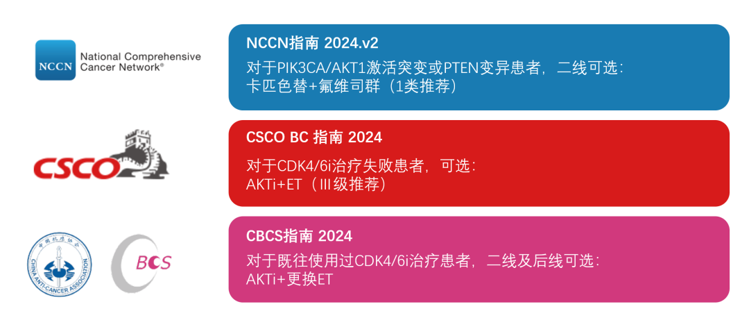 在临床应用方面,卡匹色替不仅靶向AKT,对于存在PI3KCA、AKT1以及PTEN改变,即AKT通路(即PI3K-AKT-PTEN)异常的患者均可发挥疗效。目前已开发上市的PI3Ki、AKTi和mTORi中,仅卡匹色替是唯一被证实对PIK3CA/AKT1/PTEN通路异常人群均有获益的药物,也是唯一通过Ⅲ期临床研究证实对CDK4/6i经治人群有效的药物。卡匹色替在疗效广泛获得认可的基础上,其安全性也总体可控,主要≥3级不良事件为皮疹(15.5%)、腹泻(7.0%)、低钾血症(5.6%),临床处理经验成熟。基于可靠的机制、强大了疗效和可控的安全性,卡匹色替已获得国内外指南推荐:《NCCN指南2024v2》建议对PIK3CA或AKT1激活突变或PTEN变异人群,二线及其后使用卡匹色替联合氟维司群作为标准治疗方案。《中国抗癌协会乳腺癌规范化诊疗指南与规范2024》、《中国临床肿瘤学会乳腺癌诊疗指南2024》在此次更新中,均将AKTi联合内分泌治疗作为CDK4/6i经治人群二线及后线治疗的可选方案,为患者带来了新的选择。后CDK4/6时代,AKT抑制剂卡匹色替在HR+乳腺癌二线及其后应用的标准治疗地位,可见一斑。